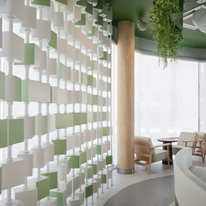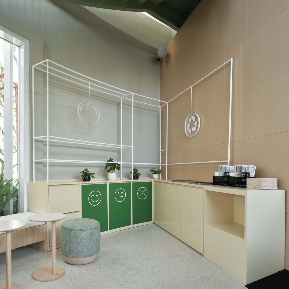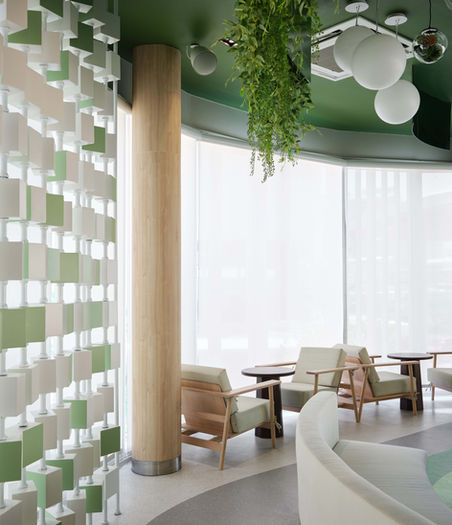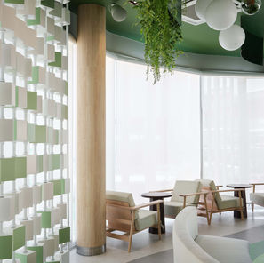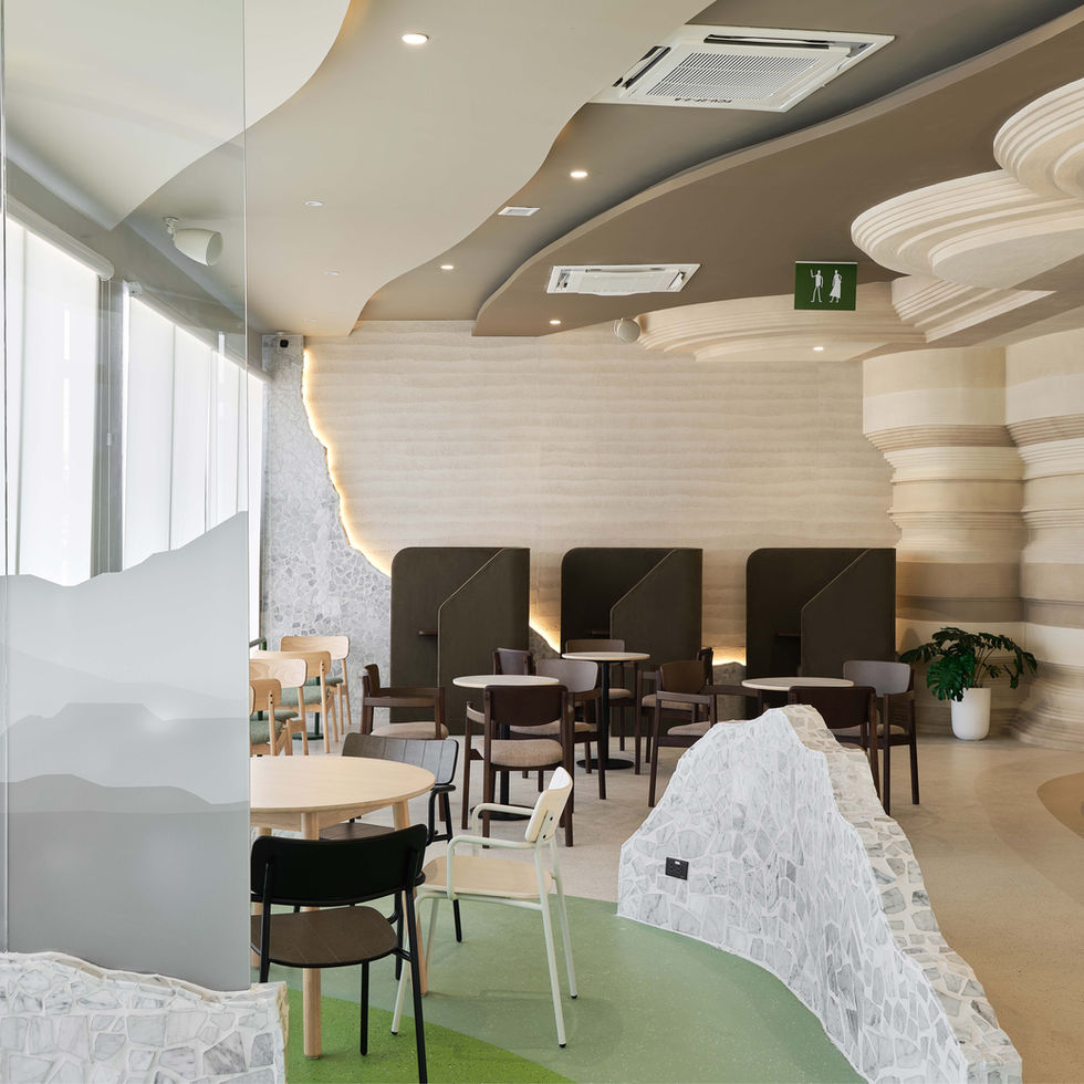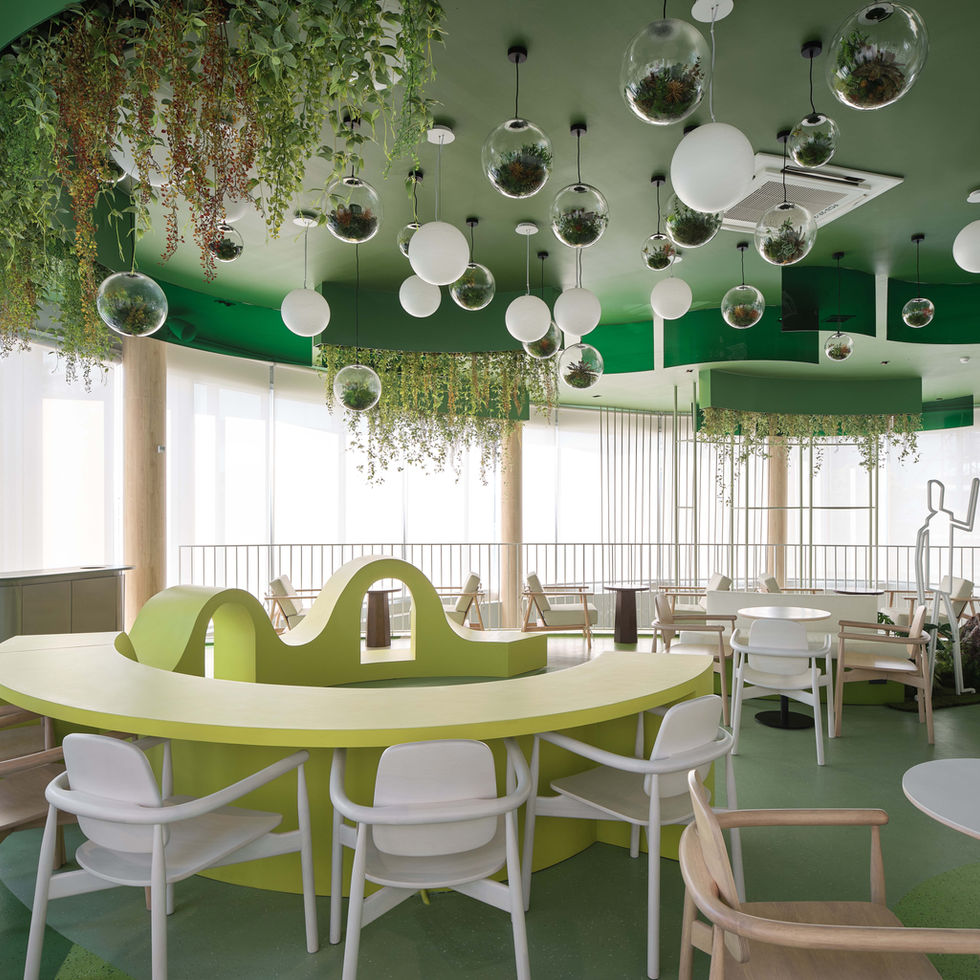 The 'Family Area' seamlessly extends the forest-inspired concept from the first floor, manifested in the color palette and organic layout and seating arrangements. This area accommodates all users, including children, and features a flip board panel as a playful way to convey brand messages, transforming into letters or symbols with each flip.