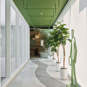The 'Work Space' stands out as a prominent area, embodying the concept of an Amazonian cave. Its walls and ceiling panels have been meticulously crafted to evoke the layers, forms, and colors reminiscent of natural cave walls. Each distinct section within this space has been thoughtfully designed to accommodate a variety of working styles, with distinct floor patterns and customized marble crack panels ensuring that each area enjoys its own sense of privacy and functionality.